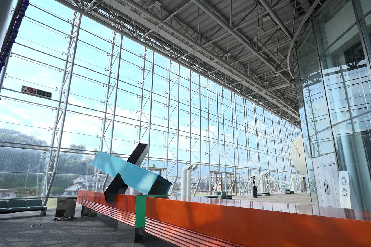 白石市文化体育活動センターのコンサートホールは、「屋外にいるような明るいオーディトリウム」を目指して設計され、その象徴となるのが、エントランスに採用された 東・西・南の3面を大きく開放したガラス張りの構成です。